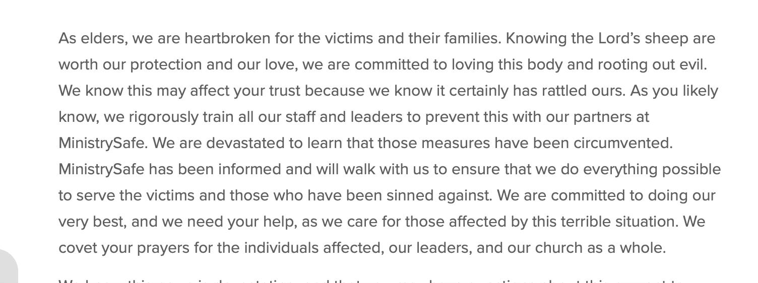 - The statement gives platitudes, but the church, and most importantly, the victims, need action: In the end, the church is committing to nothing specific. I mentioned this in my original article, but it is worth saying again here: the church very much lays the total weight of the abuse that transpired on the shoulders of Aaron while passively removing all blame from themselves.