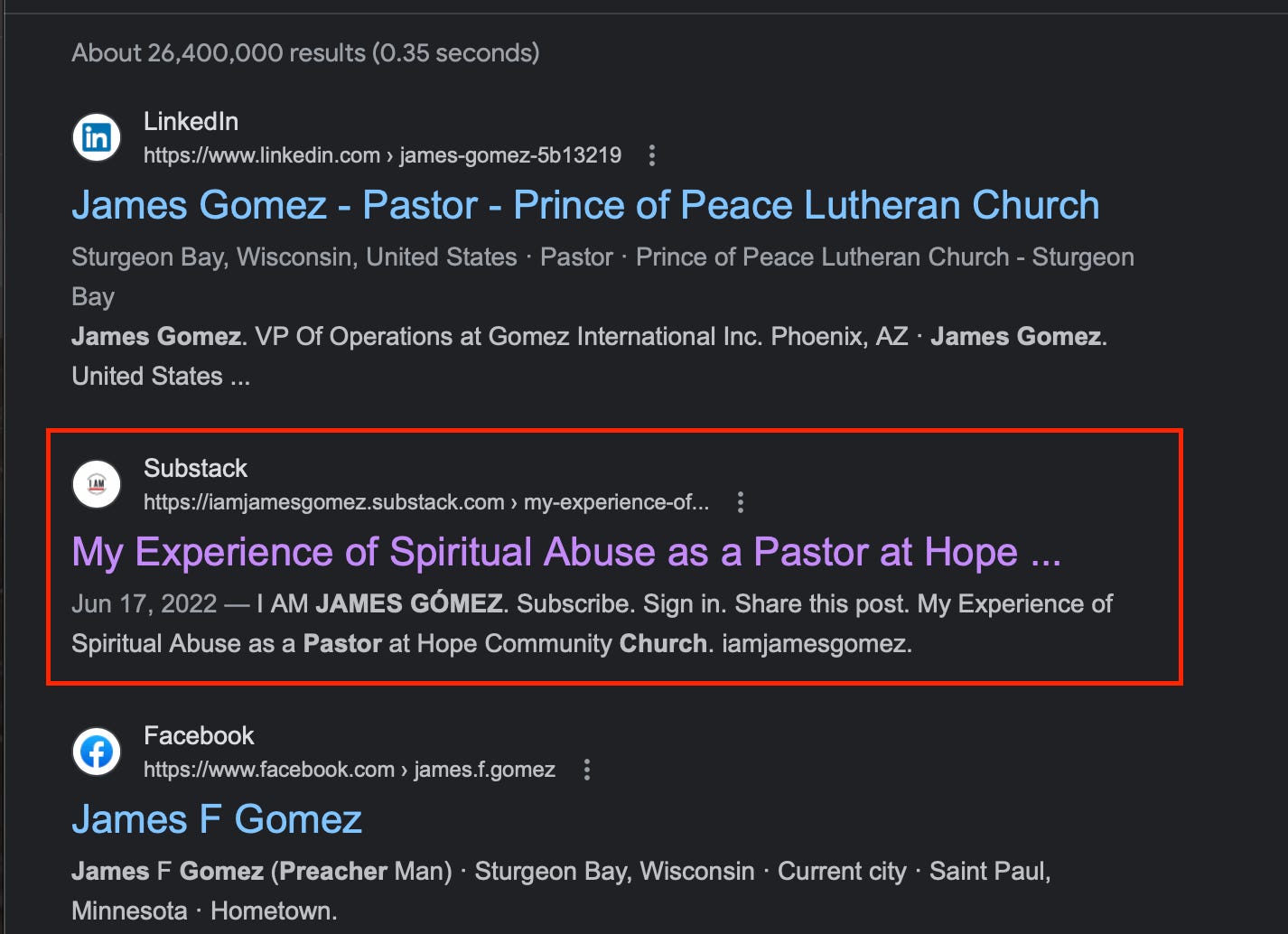 Approximately 40% of my current subscribers found me because of my article, My Experience of Spiritual Abuse as a Pastor at Hope Community Church. The article has well over 7,000 views and is the top result you’ll find if you Google my name. I’m not joking, check it out: